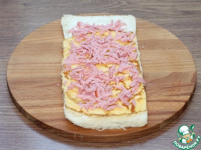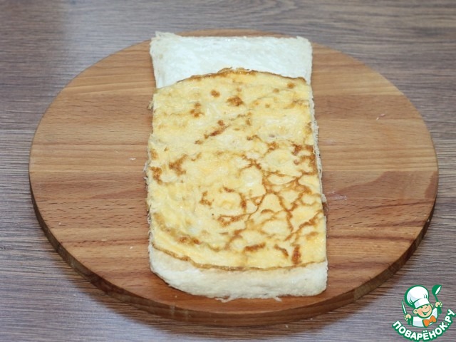 7. Выложите 1 омлет на хлеб, срежьте по краям лишнее и смажьте сливочным сыром (0,5 ст. л.).