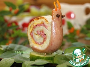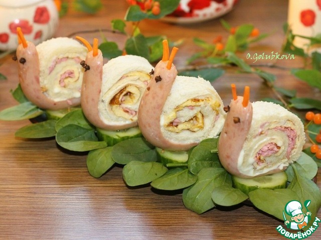 Приготовьте для детей, этот забавный сэндвич. Сэндвич "Улитка" - это сытный яичный рулет с сосиской и сыром в форме улитки и в сопровождении зелени, имитирующей травку.