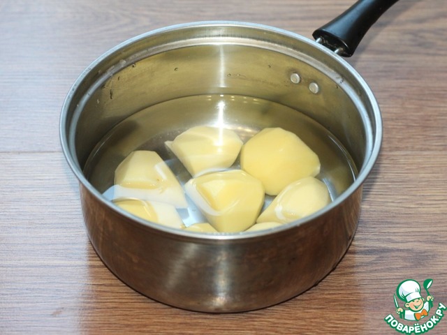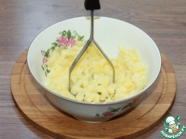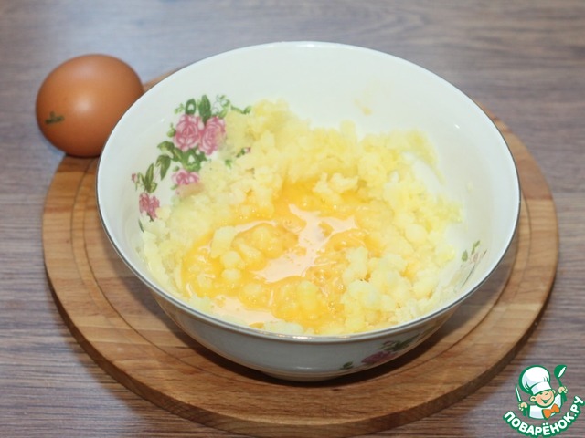3. Вбить куриное яйцо с щепоткой соли. Добавить 0,5 яичной смеси и 1 ст. л. сливочного масла в картофельное пюре.