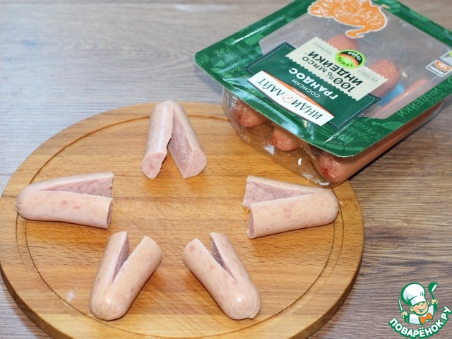 5. Разрезать сосиски на равные половинки. Сделать надрез, но не до конца.