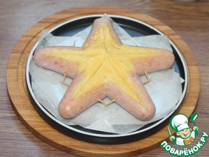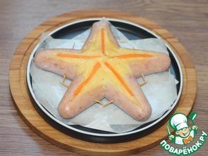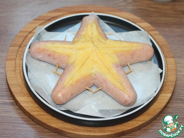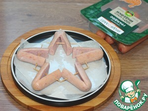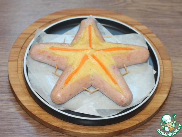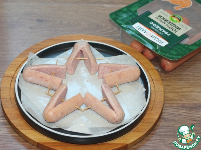 6. Форму для запекания застелить пекарской бумагой и смазать растительным маслом. Скрепить зубочисткой и слегка раскрыть сосиску. Соединить половинки сосисок в виде звезды.