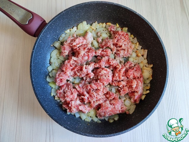 Репчатый лук нарезать произвольно, можно не мельчить. Далее на сковороду добавить топленое масло (2 ст. ложки). Пассеровать лук до легкой золотистой корочки, затем добавить фарш (200 гр.). Добавить соль по вкусу.