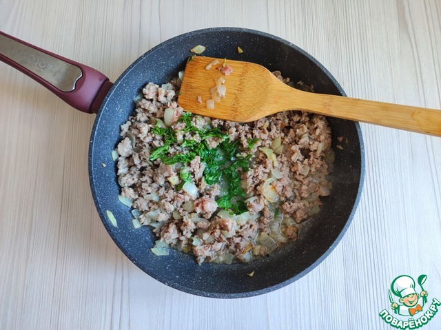 Обжарить фарш на среднем огне до готовности. Свежую зелень петрушки и укропа измельчить, добавить в обжаренный фарш. Далее смесь пробить блендером до ровной гомогенной структуры (не все дети любят жареный лучок, поэтому такой вариант приготовления начинки для запеканки будет наиболее приемлем.)
