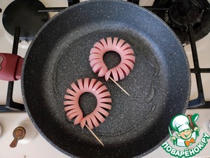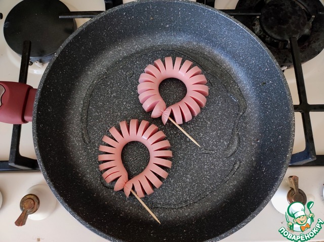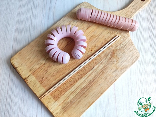 Сосиски освободить от оболочки, поместить каждую сосиску между деревянных шпажек для приготовления шашлычков и сделать разрезы (см. фото)