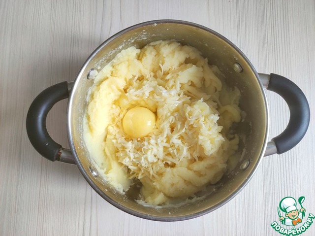 Отварить картофель (5 шт.) в подсоленной воде до готовности, далее воду слить, картофель пюрировать, затем в теплое картофельное пюре добавить натертый сыр и яйцо (1 шт.). Картофельное пюре хорошо вымешать.