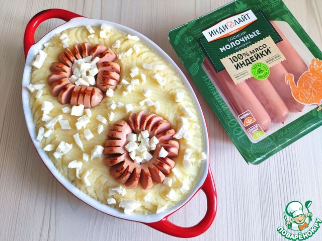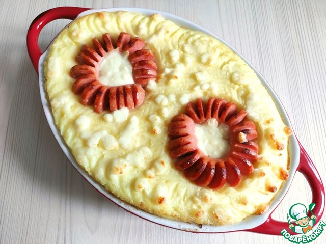 Затем добавить остальную часть картофельного пюре. Сверху выложить колечки из обжаренных сосисок. Конструкцию присыпать кусочками сыра Моцарелла. Форму отправить в разогретый до 180-200С духовой шкаф. Запекать блюдо легкой золотистой корочки.