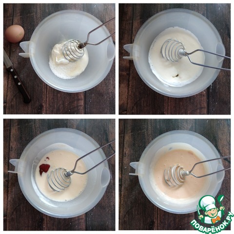 Я для комплектовки ланч-бокса буду выпекать несладкие кексы томатные с сосисками на сметане. Для перекуса школьнику они подойдут. По вкусу и аромату напоминают пиццу, а, как известно, дети её любят и едят. Делаем тесто. В посуду выкладываем сметану, сахар и разрыхлитель. Венчиком перемешиваем. Ждём реакцию на кислую среду. Добавляем яйцо. Соединяем. Выкладываем в смесь лечо или томатный соус натуральный домашний, или томатную пасту. Соединяем.