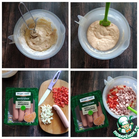 Просеиваем муку понемногу, добавляем соль. Тесто густое. Наливаем масло подсолнечное. Перемешивать тесто лучше силиконовой лопаточкой. Перец болгарский, лук репчатый и сосиску нарезаем очень мелко. Я использую в рецепте кексов сосиски Молочные ТМ ИНДИЛАЙТ. Отправляем всё в тесто.