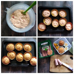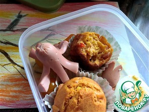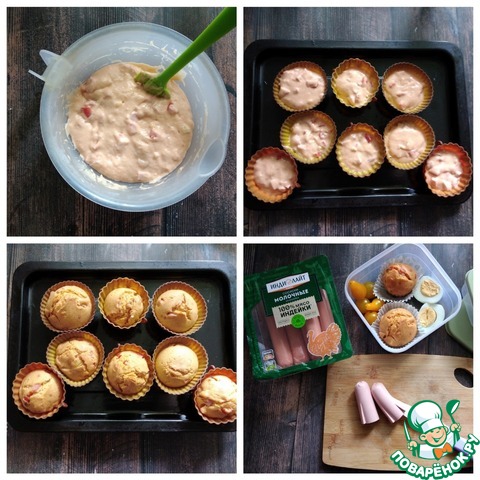 Тщательно перемешиваем. Тесто к выпечке готово. Выпекать кексы я буду в силиконовых формочках стандартного размера. Перед тем как выложить в них тесто я всегда обливаю их водой. Выкладываем тесто на 2/3 высоты формочек. При выпечке они будут подниматься. Количества теста мне хватило на 8 формочек. Ставим в разогретую духовку до т-180 С на 15 минут. Проверяем деревянной шпажкой на готовность. Тесто к ней не пристаёт и она остаётся сухой - готовы. Ориентируйтесь на свою духовку. Кексы хорошо поднялись, пропеклись, сверху с трещинками, ароматные. Вынимаем кексы из духовки и даём им немного остыть. Легко извлекаем их из форм. Я их переложу в бумажные формочки. В бумажных формочках очень удобно мне будет их поместить в ланч-бокс. Кексы вкусны и тёплые, и остывшие. Для комплектовки ланч бокса возьму 2 кекса и отварю ещё сосиску. Я сделаю её "осьминожками". Разрежу пополам и надсеку концы на 8 "ножек" (см фото). Отварю буквально 1 минуту в кипящей воде. Яйцо сварю вкрутую.