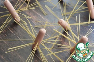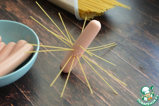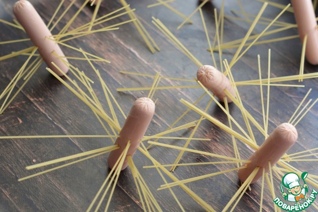 В каждую сосиску начиная от центра начните втыкать спагетти по 1-2 шт. Спускаясь ниже воткните спагетти еще несколько раз. На каждую сосиску около 10 шт. спагетти. -