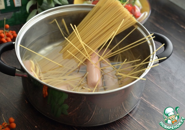 Действуйте довольно быстро, но осторожно. Осторожно, чтобы спагетти не сломались. А быстро, потому что от влаги в сосисках спагетти могут начать размокать и обламываться. -
