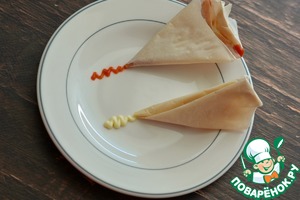 А тем временем сделайте кулёчки из пергамента с кетчупом и майонезом.