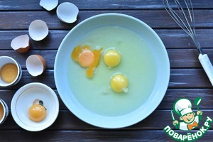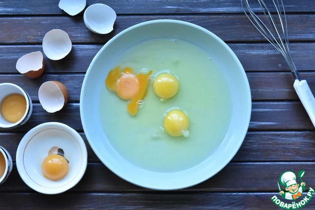 В миску разбиваю три целых яйца и три белка. Три яичных желтка откладываю.