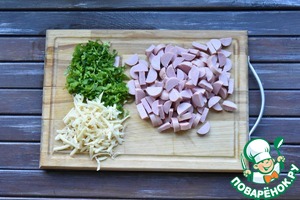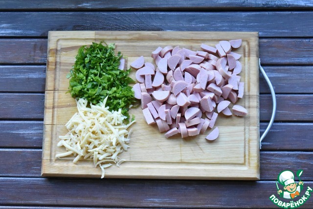 Нарезаю сосиски. натираю на крупной терке сыр, измельчаю зелень