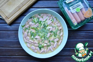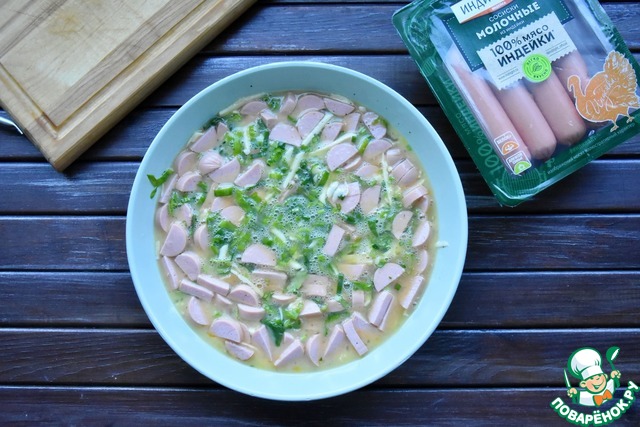 Размешиваю яйца с помощью венчика. Добавляю нарезанные сосиски, зелень и сыр. Солю, перчу и перемешиваю