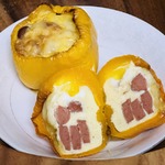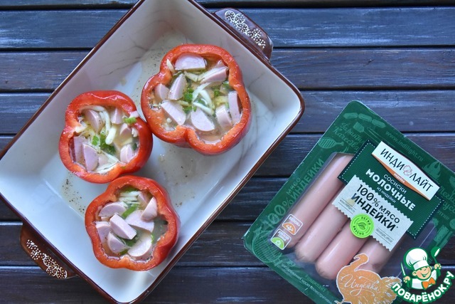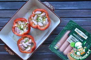 Устанавливаю обжаренные перцы в форму для запекания. Внутрь раскладываю подготовленную начинку.