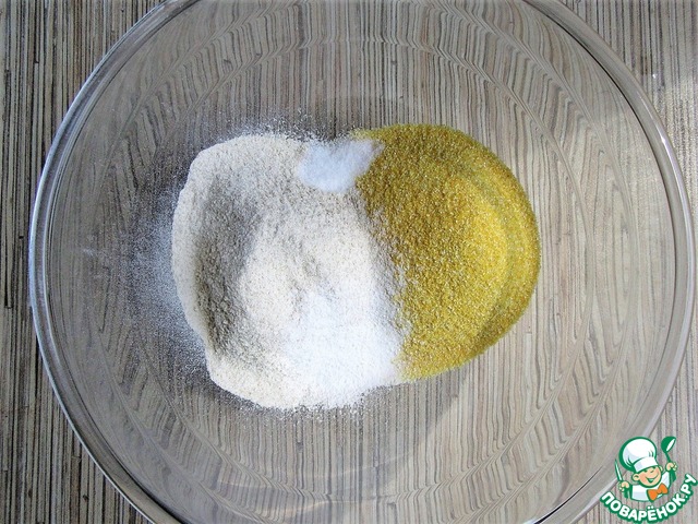 Смешать цельнозерновую муку с полентой, солью и разрыхлителем.