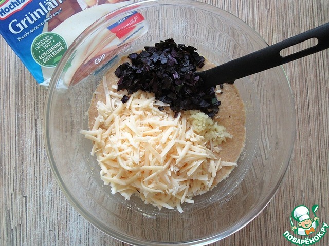 Добавить тертый сыр (у меня ТМ Hochland), измельченный чеснок и нарезанные листики базилика, перемешать.