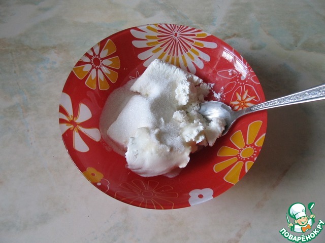 Смешать творог, сливочный сыр, сахар и ванильный сахар.