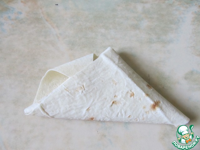 1 ст. л начинки выложить на край полоски и завернуть в треугольник.