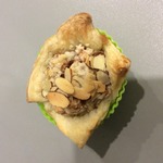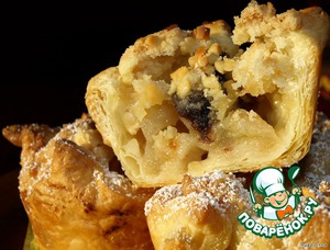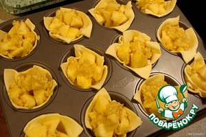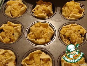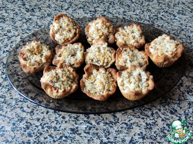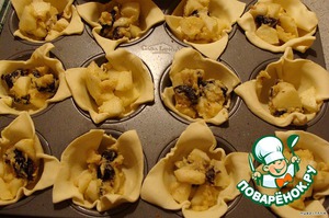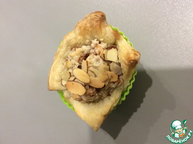 раскладываем фруктово-мучную смесь в подготовленные корзиночки из слоеного теста. Эти были у меня просто с яблоками и орехом