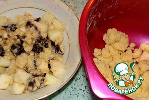 а Вы тем временем уже готовите из муки, сахара и мягкого (но не растопленного) масла песочную крошку. Часть крошки смешиваем с фруктами