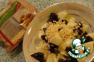 Ваш помощник чистит 2 яблока, режет на дольки (не мелко), режет чернослив, смешивает все с ванильным сахаром и орехами