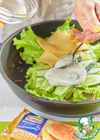Булочку разрезать пополам и подрумянить на сухой сковородке. Можно взять специальную для гамбургера, но мы взяли сладкую. У нас в магазине она называется "Сдоба школьная".
