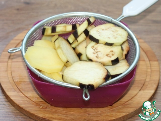 6. Баклажан и картофель очищаем от шкурки и нарезаем кружочками. Кружочки баклажана пересыпаем солью и оставляем до выделения сока, минут 20. Картофель бланшируем в подсоленной и кипящей воде до полуготовности.