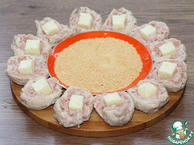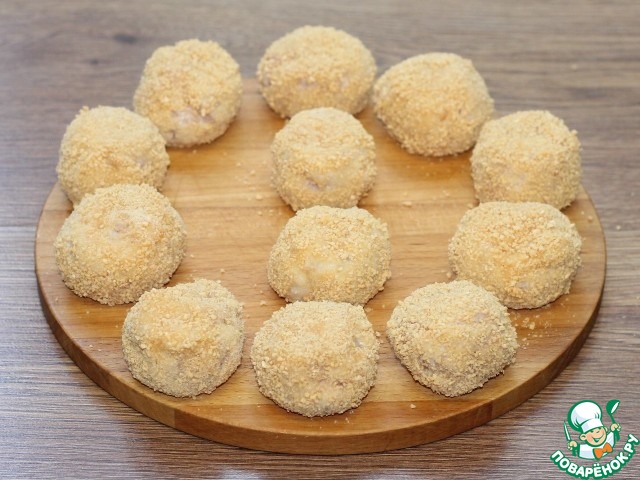 10. Закрываем фаршем начинку и формируем шарик. Макаем шарик в яичный желток и обваливаем в панировочных сухарях.