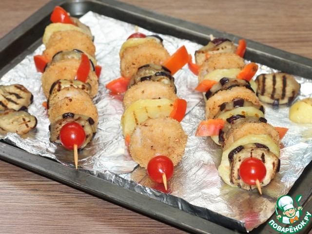 12. Нанизываем крокеты на шпажки, чередуя их с овощами. Готовить крокеты с овощами можно на природе или дома в духовке. Застилаем противень фольгой и кладем шашлычки. Сбрызгиваем их растительным маслом.