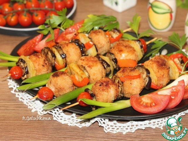 Рецепт «Шашлычки из крокетов с сыром и овощами»: