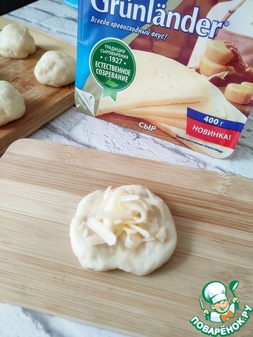 Руками разомните кусочек теста в лепёшку. На середину выложите немного сыра.