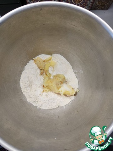 Смешать сухие ингредиенты для теста, добавить масло, растереть в крошку. Муку можно брать всю в/с. Но с цельнозерновой вкус богаче. И структура грубее. А в этом тесте это нужно. Вместо сливочного масла я взяла утиный жир. С ним очень вкусное тесто! Но не у всех он есть.