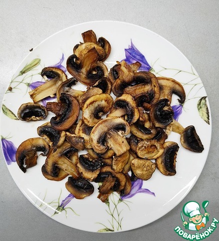 Пока наше тесто отдыхает, приготовим начинку. Грибы нарежем пластинками и обжарим на растительном масле до румяности. Чтобы грибы сохранили форму и приобрели румянец, лучше их жарить в один слой.