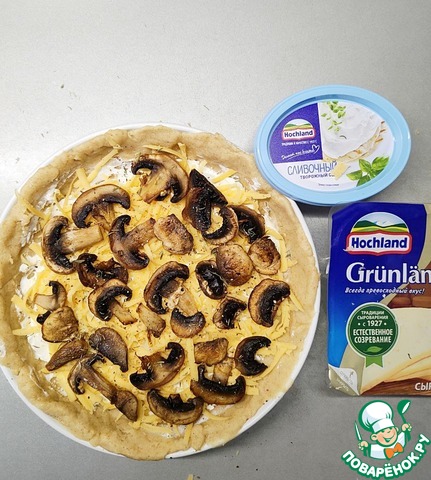 Сверху выложим грибы. Посыпать небольшим количеством тимьяна и натертым сыром.