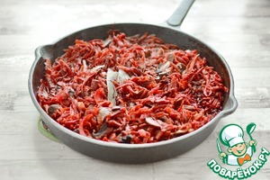 Свеклу натрите на крупной тёрке. Можно даже на "корейской". Добавьте к луку. Обжарьте их вместе около 5-7 минут. Огонь поддерживайте максимальный, чтобы свекла поджарилась и обволоклась маслом.
