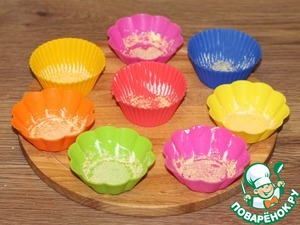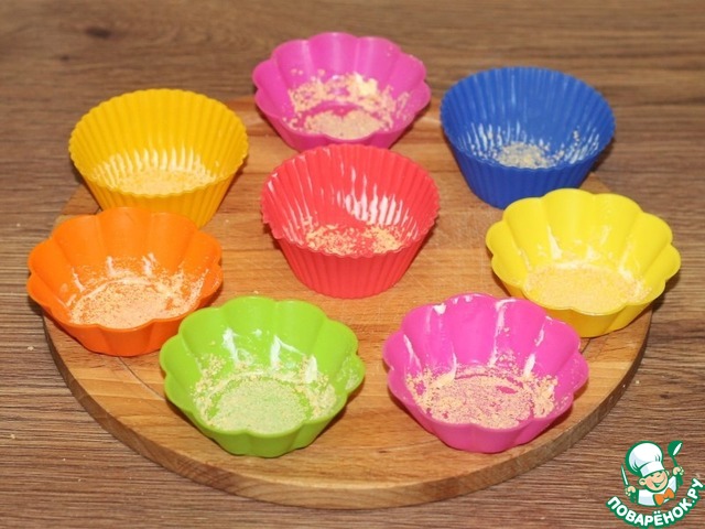 9. Разогреваем духовку до 180 градусов. На противень наливаем немного воды. Смазываем формочки холодным сливочным маслом и обсыпаем панировочными сухарями.