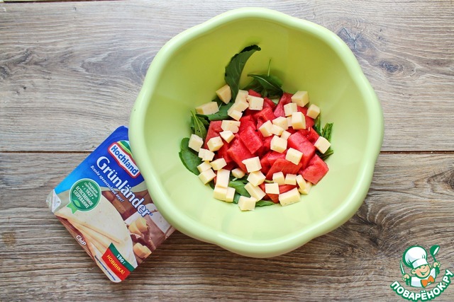 Сыр нарежьте мелким кубиком, положите в миску с арбузом и рукколой. Раньше делала с фетой, но для меня был слишком резкий переход от сладости арбуза к солености сыра. А вот с обычным сыром для меня сочетание лучше.