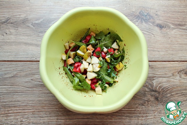 У груши удалите сердцевину и порежьте кубиком. Добавьте фрукт в салат, полейте маслом и перемешайте. Растительное масло тоже можно добавьте при желании, я иногда добавляю, а иногда нет.