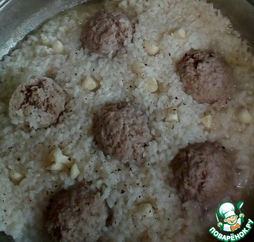 Добавляем чеснок (втыкаем крупные куски) в рис, перчим.