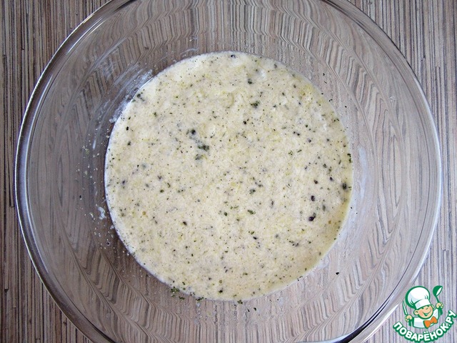 Смешать яйца с молоком, базиликом, солью, перцем и полентой.