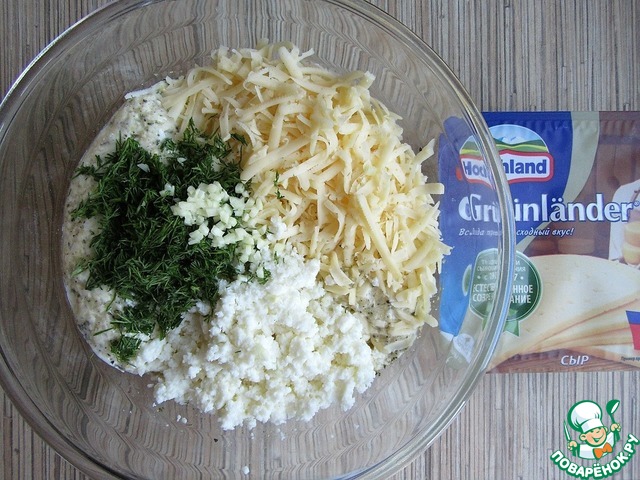 Добавить тертый полутвердый сыр (у меня ТМ Hochland), раскрошенный адыгейский сыр, укроп и мелко нарезанный чеснок, перемешать.