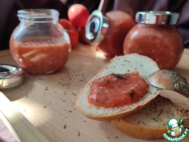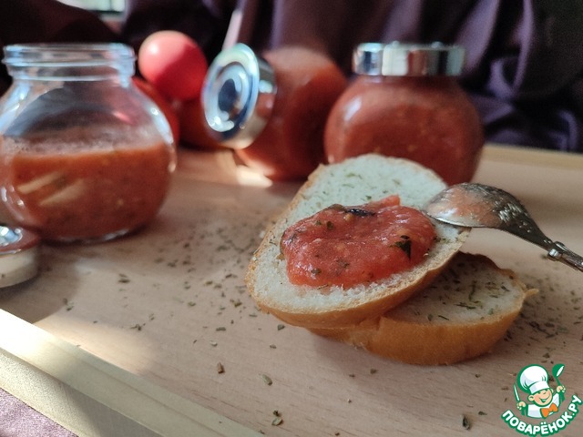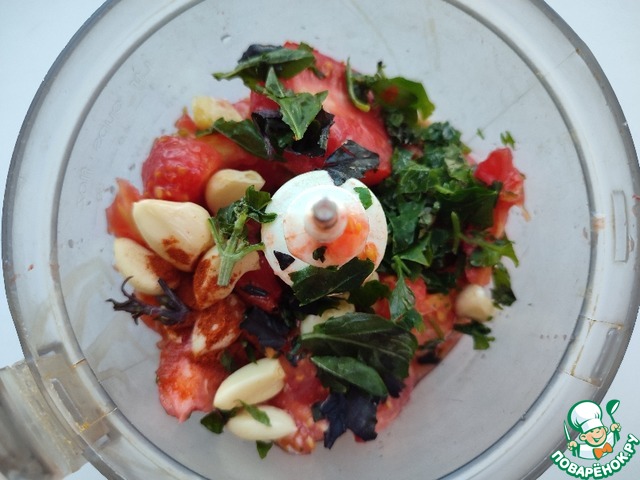 Я думаю, в каждой семье есть рецепт сырой аджики, хочу предложить вам и свой вариант. Аджику я делаю из сердцевинки помидоров, которые получаются после приготовления вяленых томатов. Добавление же трав, дарят ей непередаваемый аромат и частичку солнечного лета))) Её очень удобно замораживать и съедать частями в течении долгой, холодной зимы.