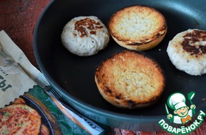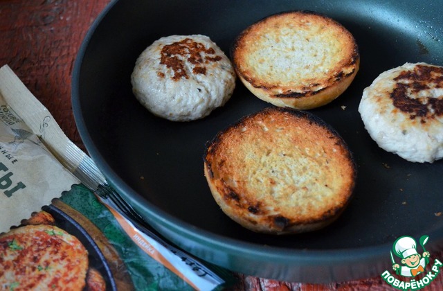 Булочку разрезать пополам, на сухой сковороде подсушить, котлеты разогреть.
