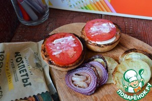 Собрать бургер. Нижнюю часть булочки смазать майонезом, на него ломтик помидора, каплю майонеза.