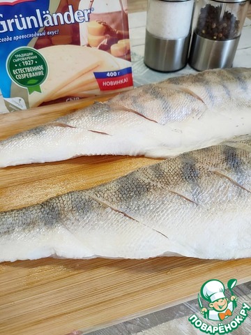 Рыбу (у меня судак) очистите от чешуи, выпотрошите. Хорошо промойте и обсушите бумажным полотенцем. Срежьте острые плавники и кончик хвоста. Разделите на два филе. Сделайте насечки на коже, чтобы рыба при жарке не деформировалась.
