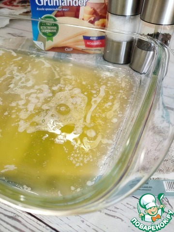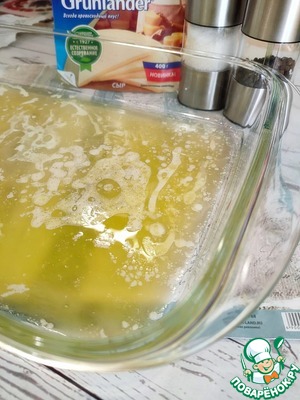 Растопите топлёное сливочное масло и вылейте его в форму для запекания.