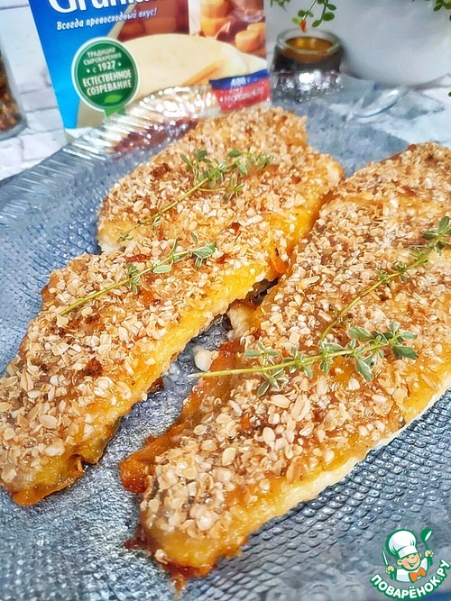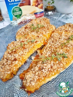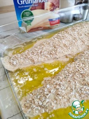 Присыпьте рыбу овсяными хлопьями и полейте растопленным сливочным маслом. Затем поставьте форму с рыбой в разогретую духовку (t - 200). Запекайте, примерно 30 минут. Выньте форму из духовки, накройте листом фольги и оставьте на 10 минут.