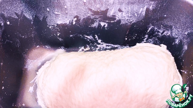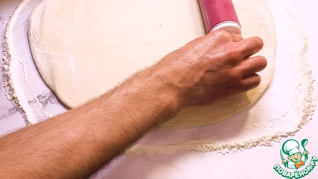 Потом стол посыпаем мукой и раскатываем тесто в тонкий пласт.